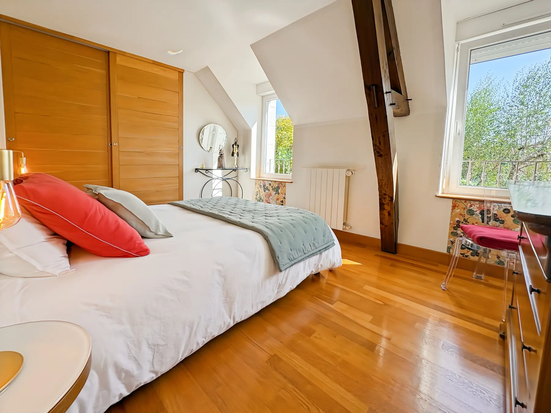 En partie nuit, le bien est composé de trois chambres, dont une suite parentale avec accès terrasse de 18 m². À l'étage, une seconde chambre de 15 m² avec placard, une troisième chambre de 14 m², une salle d'eau avec meuble vasque et douche de 6 m², ainsi qu’un WC indépendant.