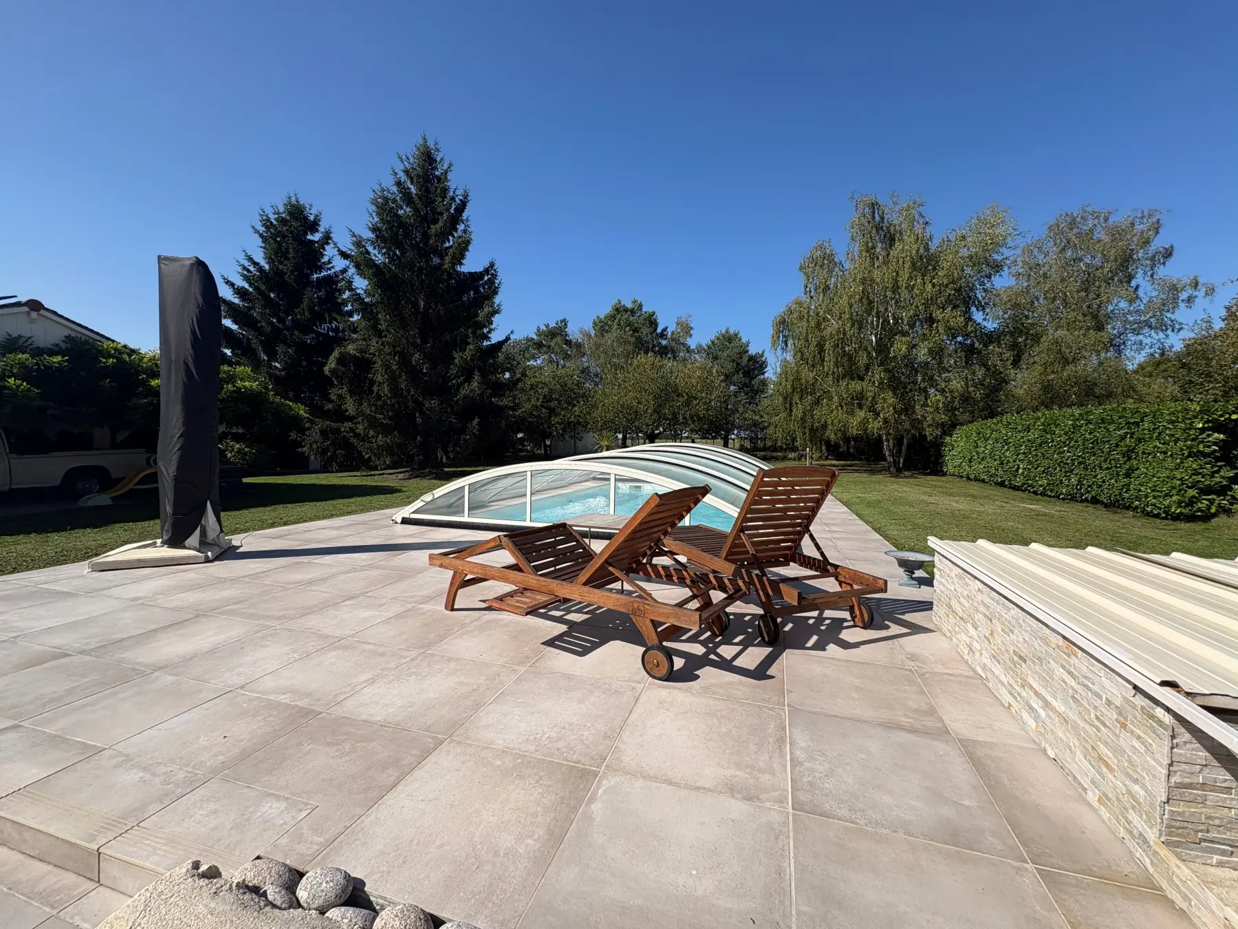 À l'extérieur, vous bénéficierez de deux terrasses : une à l'avant du bien et une autre à l'arrière, donnant sur la piscine et le magnifique jardin arboré. Un garage, accompagné d'un carport et d'un abri pour le bois, avec un espace cellier, le tout entièrement clôturé et sécurisé par un portail motorisé et une alarme.