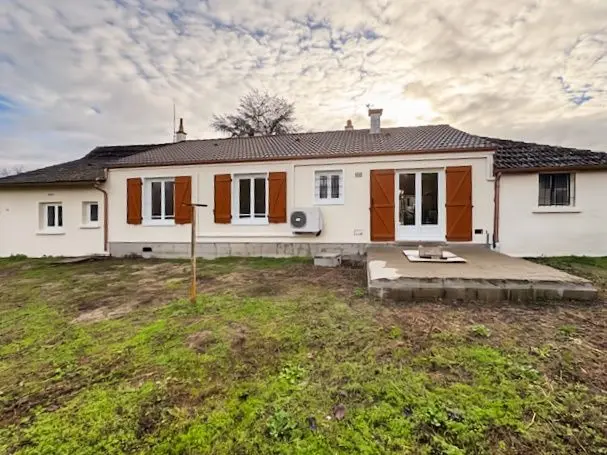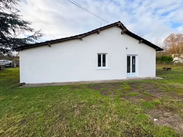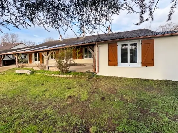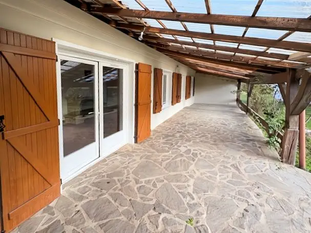 Menuiseries PVC et isolation laine soufflée. Terrasse avec préau.