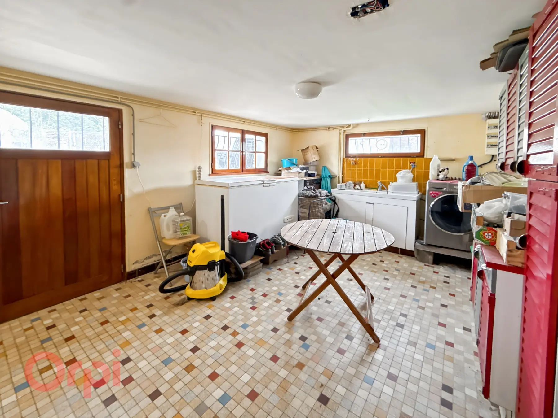 La maison repose sur un sous-sol complet comprenant une buanderie, une cave et deux grands garages avec double porte, permettant de stationner plusieurs véhicules ou de bénéficier d’un espace atelier.