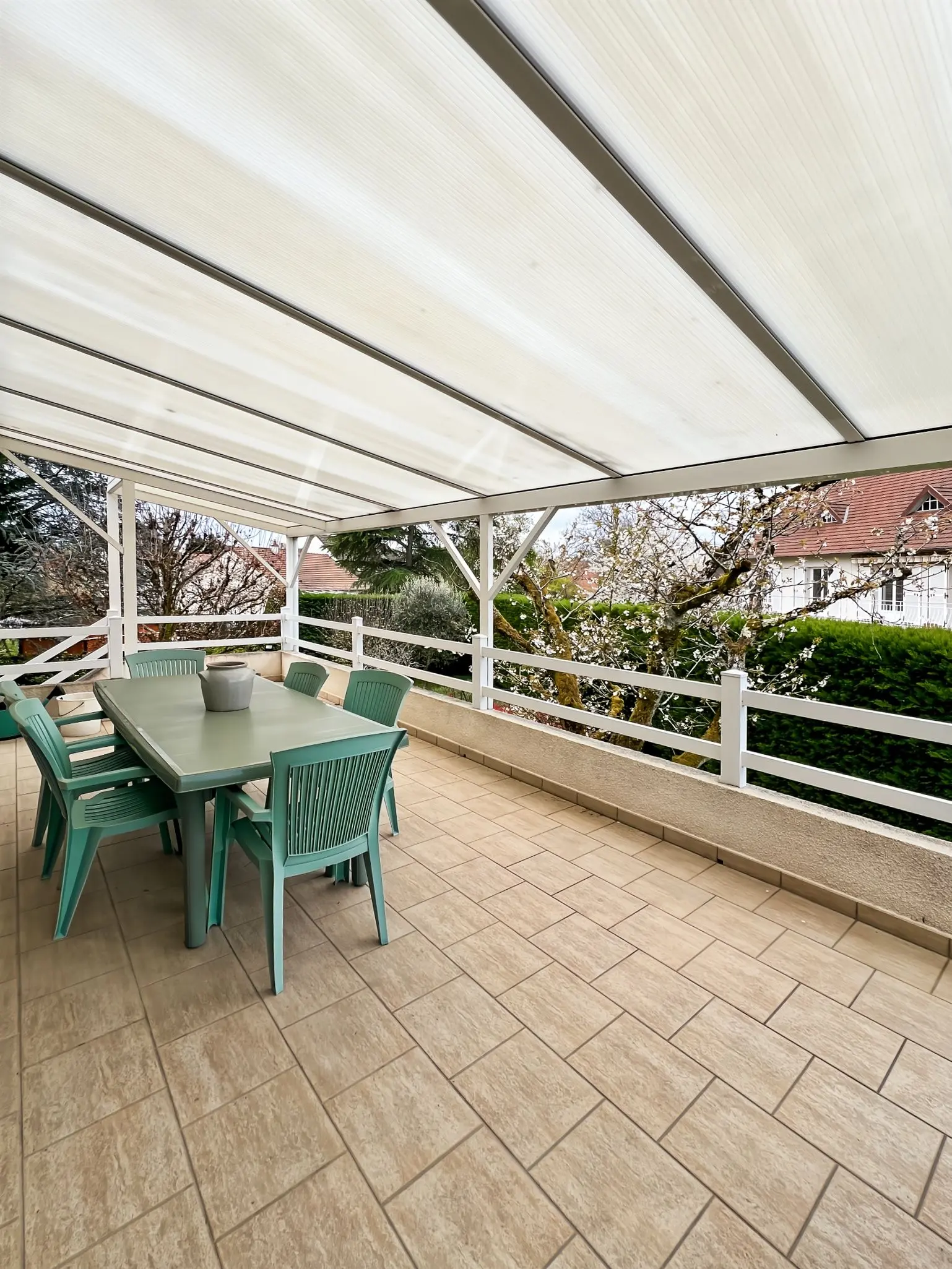 À l’extérieur, vous profiterez d’une grande terrasse/véranda surélevée, idéale pour vos moments de détente.